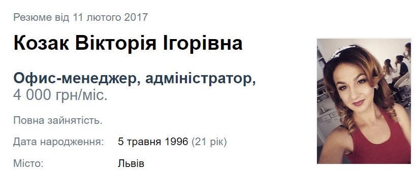 У копії паспорту 21-річної Вікторії Козак вказано, що до жовтня 2016 року вона мешкала в селі Волощина Перемишлянського району, а потім переїхала до Львова. У лютому цього року вона шукала роботу адміністратора або офіс-менеджера із зарплатнею в 4 тис. грн. Досвід роботи в резюме відсутній.