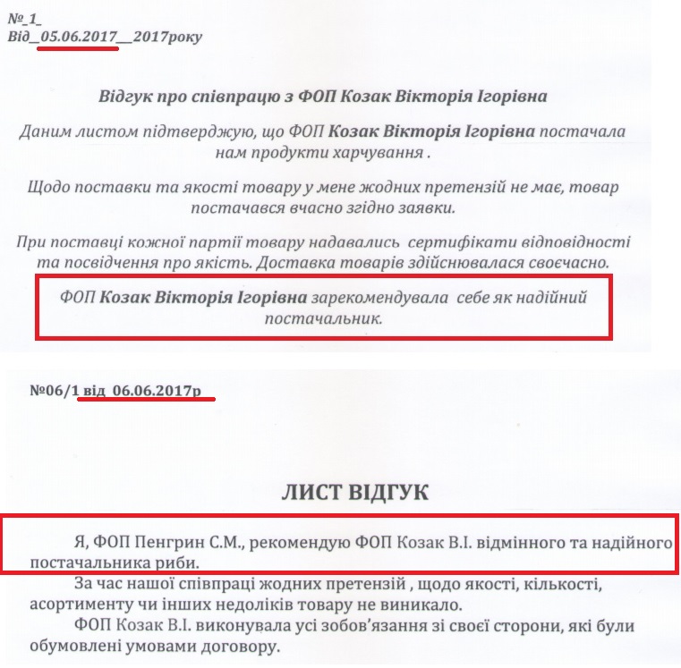 Незважаючи на дуже короткий термін ведення підприємницької діяльності, вона надала два позитивні відгуки від інших підприємців про постачання продуктів, які датовані 5 і 6 червнем. Відтак, за чотири дні, серед яких два вихідних, Вікторія Козак змогла придбати продукцію, підписати договори і успішно продати продукти.