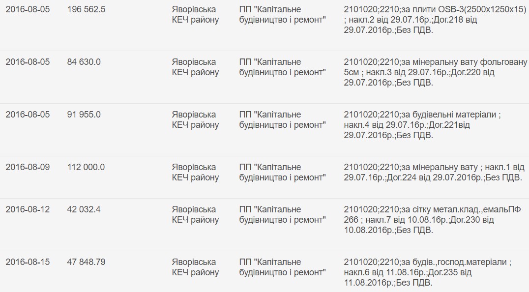 Далі вже пішло як по-писаному. 29 липня 2016 року, лише за кілька днів до переходу країни на Prozorro, Яворівська КЕЧ підписала з фірмою договори на суми менші ніж 200 тис. грн. Дрібність сум компенсується тим, що їх не потрібно оприлюднювати для широкого загалу.