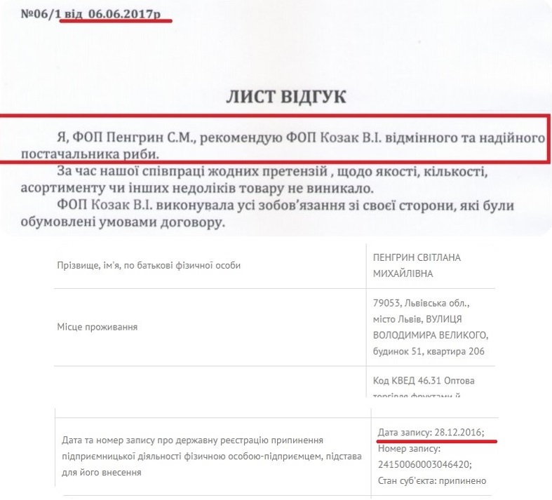 Окрім того, один із наданих Вікторією Козак відгуків від підприємця, яка припинила діяльність ще минулого року. Так, у Prozorro завантажено відгук від підприємця Світлани Пенгрин датований 6 червнем цього року, однак згідно з реєстром Мін’юсту, вона припинила діяльність ще 28 грудня 2016 року.