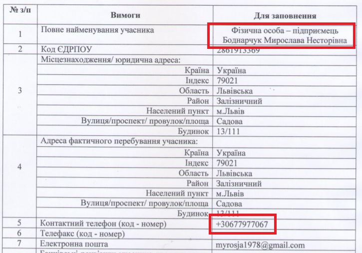 Світлана Пенгрин при реєстрації підприємцем вказувала мобільний номер телефону 0677977067. Таким же є номер мобільного телефону підприємця Мирослави Боднарчук, яка конкурувала з Вікторією Козак на торгах із закупівлі риби.