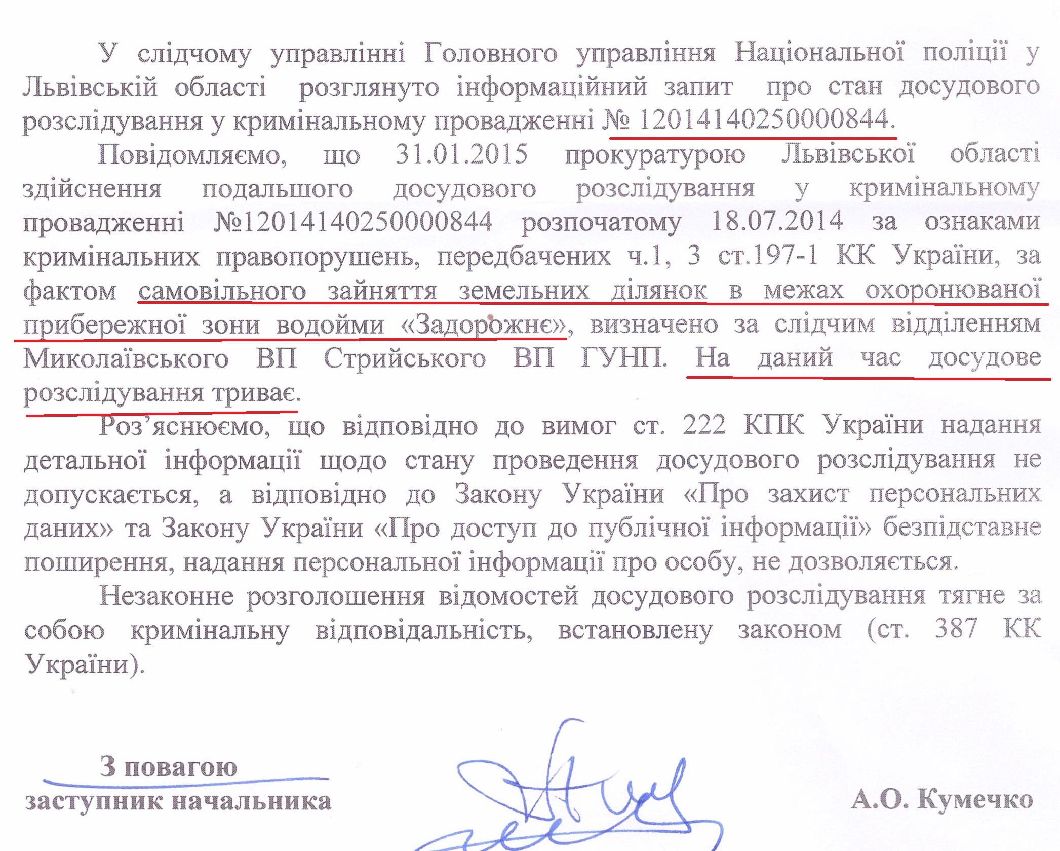 Щодо діяльності родини Драбиків та інших власників ділянок на першій лінії садового товариства, у серпні 2014 року було відкрито аж три кримінальних провадження “за фактом самовільного зайняття земельних ділянок в межах охоронюваної прибережної зони водойми Задорожнє”. Після їх об’єднання в одну справу, у жовтні 2016 року, розслідування припинили “у зв’язку з відсутністю складу кримінального правопорушення”.