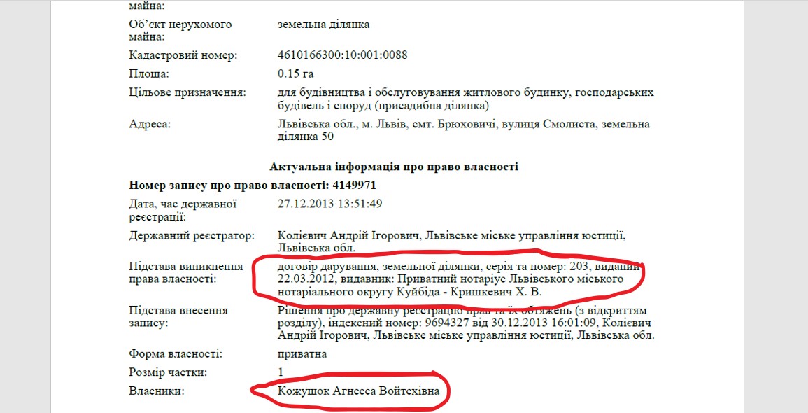 Наприклад, великий маєток в Брюховичах під Львовом належить його тещі – 87-річній Агнессі Кожушок. Це два будинки на вулиці Смолистій, обнесені спільним парканом на двох земельних ділянках загальною площею 0,5 га.