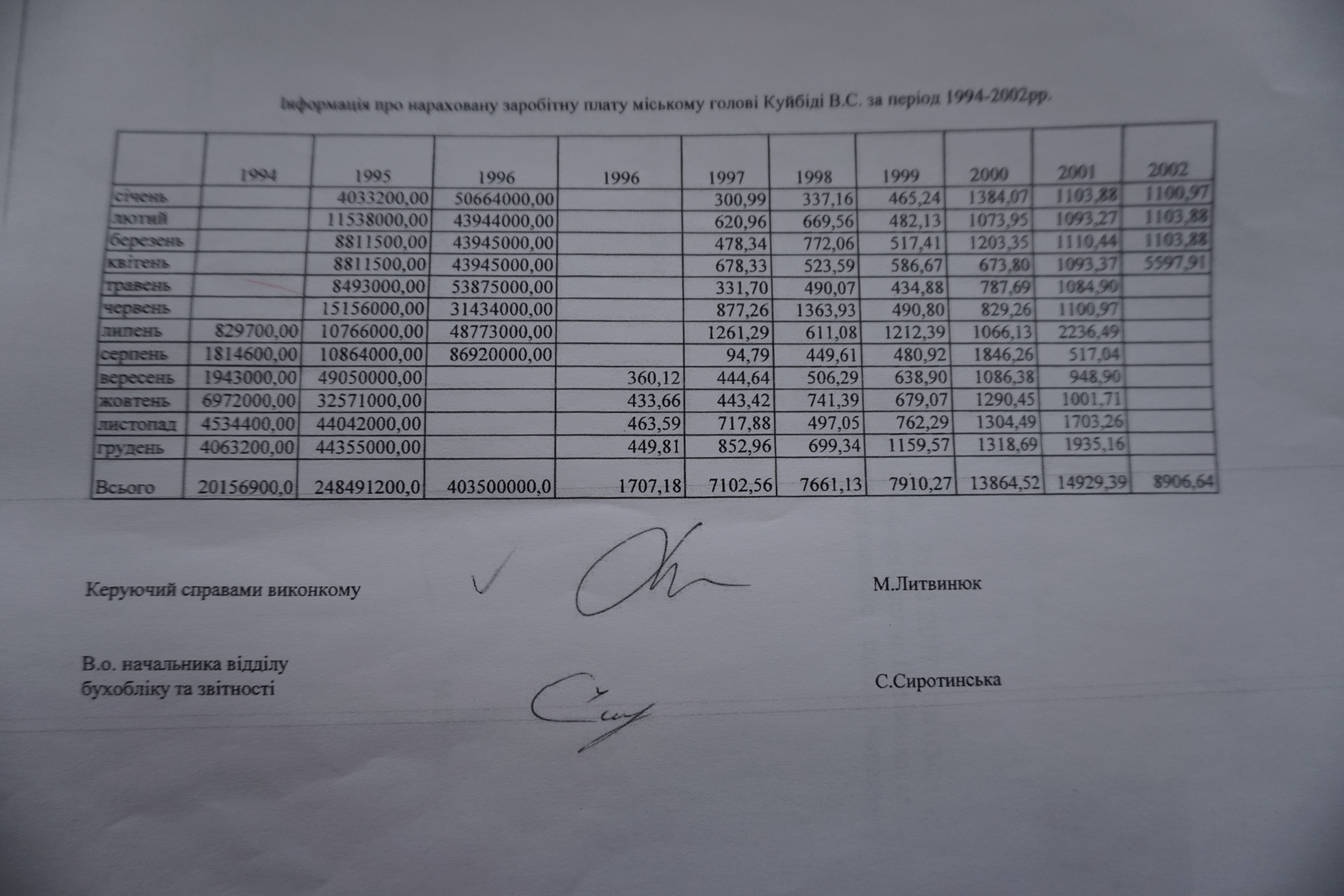 За 10 років перебування на посаді мера Львова Василь Куйбіда статків також не заробив. Згідно з відповіддю Львівської міської ради на запит про зарплата мера міста в період з 1994 по 2002 рік становила 75,52 тис. грн. З цієї суми, до введення гривні у вересні 1996 року, на посаді міського голови Куйбіда заробив 672,1 млн купонокарбованців, тобто 6,72 тис грн.