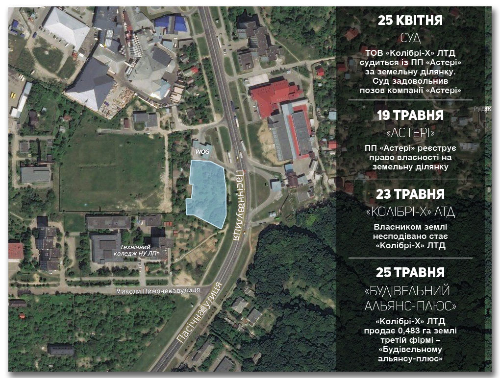 Ділянка площею 0,483 га на вулиці Пасічна, 146, про яку піде мова далі, вперше з’являється в рішенні Господарського суду Львівської області від квітня 2017 року. Дві львівські фірми подали позови одна проти одної – ТОВ «Колібрі-Х» ЛТД та ПП «Астері».