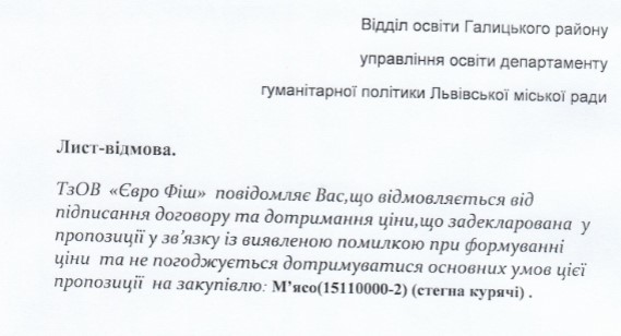 Аналогічним чином відділ освіти Личаківського району управління освіти не зміг купити дешевші на 114 тис. грн печиво та на 101 тис. грн цукор у «Євро Фіш», бо фірма відмовилась підписувати договір. Як ви вже зрозуміли, постачальником стало «Галбізнес Груп».