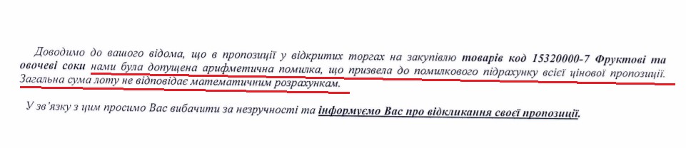 Враховуючи, що на торги не прийшов ніхто, окрім них, то замовник, звичайно, підписує угоду з компанією, яка пропонує дешевшу пропозицію. Але раптом, коли доходить справа до підписання угоди, «найдешевша» компанія «Євро Фіш» відмовляється від підписання договору через … арифметичну помилку в розрахунку ціни.
