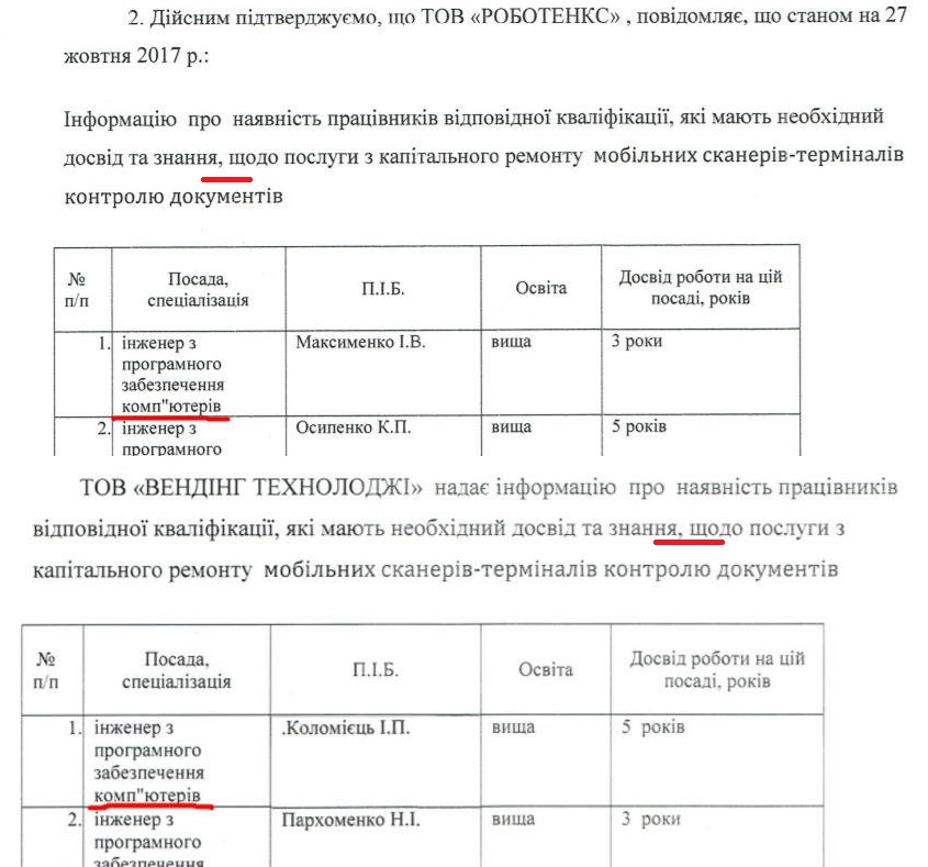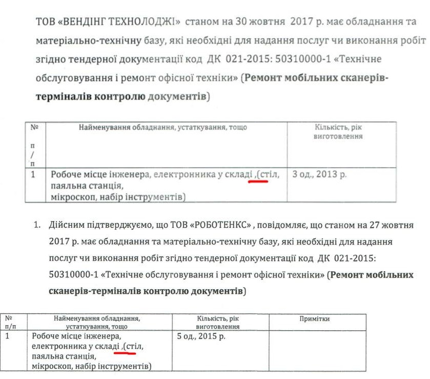 Документи, які подали на торги обидві компанії, мають чимало спільного. Завантажені практично в однаковий час, вони мають однакові назви. Більше того, згідно з тендерною документацією, деякі документи можна було подавати в довільній формі (довідки про матеріально-технічну базу, працівників тощо). Проте в обох фірм довідки ідентичні і навіть з однаковими помилками.
