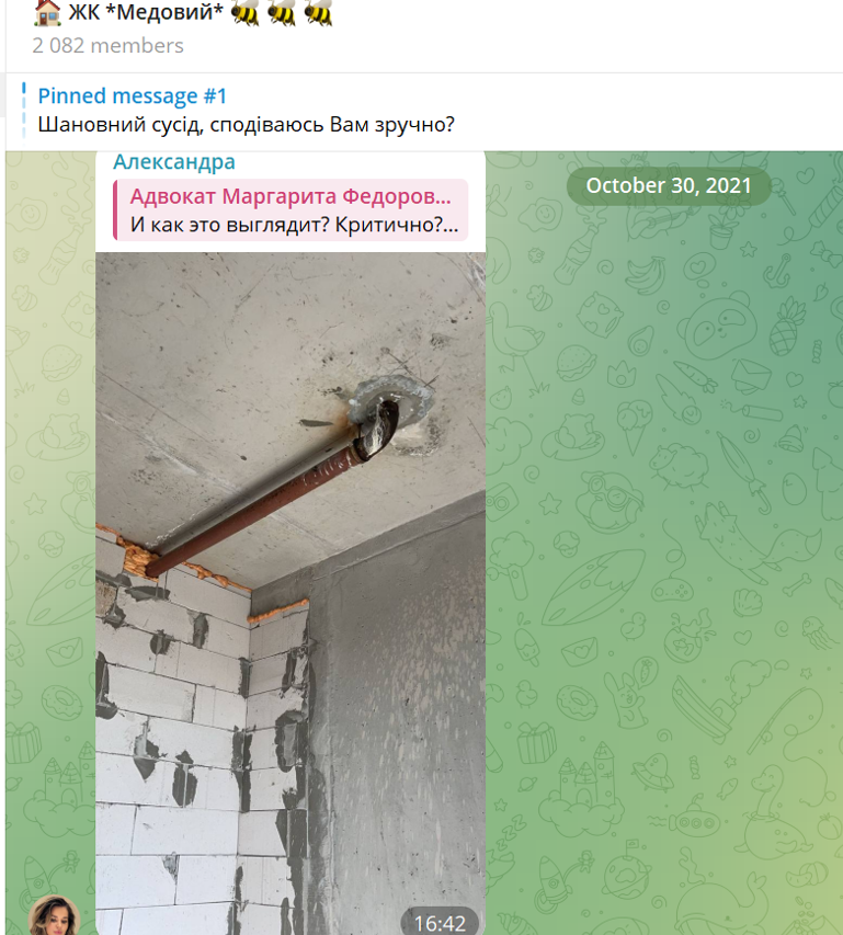 Наприклад, у 2021 році Олександра Трофіменко переймалася трубою у квартирі і шукала поради у сусідів. «Добрый день. Подскажите, пожалуйста, ( инвесторы , которые приобрели квартиры на 25 этаже) столкнулись ли вы с такой проблемой как «ливневка» труба проходящая через квартиру?» збережена авторська орфографія і пунктуація, – питала вона, долучивши фото злощасної труби.