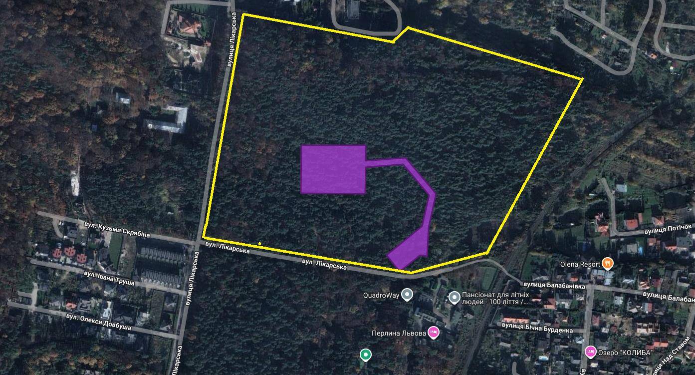 Повністю вкрита лісом ділянка, на якій планують масштабне будівництво, розташована в північній частині Брюховичів офіційна адреса – вул. Лікарська, 4 і фактично контролюється ТОВ «Оріон-Експорт».