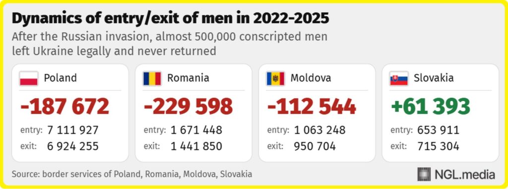 However, the total scale of draft-age men, fleeing Ukraine, is much larger. According to the estimates of NGL.media, based on the data about border crossings, since the beginning of the full-scale war, about 470 thousand men legally left Ukraine and didn’t come back, and at least 70 thousand more crossed the border illegally.